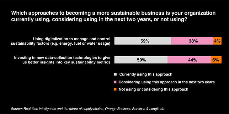 The landscape, however, is changing. Currently, 58% of enterprises responding to our survey said they digitally control and manage sustainability metrics such as energy, fuel, carbon emissions and water usage, with 38% of respondents saying they plan to do so within the next two years. For example, AI-enabled smart logistics can play a central role in reducing fuel usage and increasing on-time deliveries.