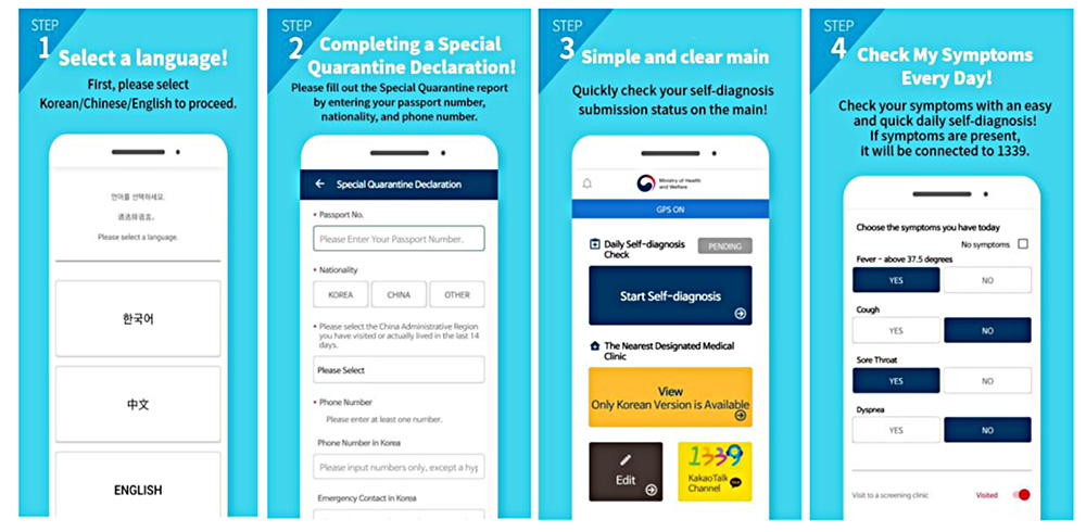 DH : L’installation de l'application mobile Covid-19 Self-quarantine a été recommandée à toute personne en situation de quarantaine. Cette application permet de surveiller les mouvements des personnes confinées, mais elle respecte certaines conditions. Les utilisateurs doivent accepter la collecte de leurs données personnelles et l’utilisation de leurs informations de géolocalisation. Les services de Police peuvent être alors alertés si des individus se sont trop éloignés du lieu où ils séjournent en quarantaine et ces derniers peuvent être condamnés à une amende ou à une peine d'emprisonnement conformément à la loi sur le contrôle et la prévention des maladies infectieuses Infection Disease Control and Prevention Act. L'application sert également de canal pour signaler les symptômes auto-diagnostiqués, et fournit des directives de quarantaine et les coordonnées du fonctionnaire du gouvernement chargé de la surveillance.