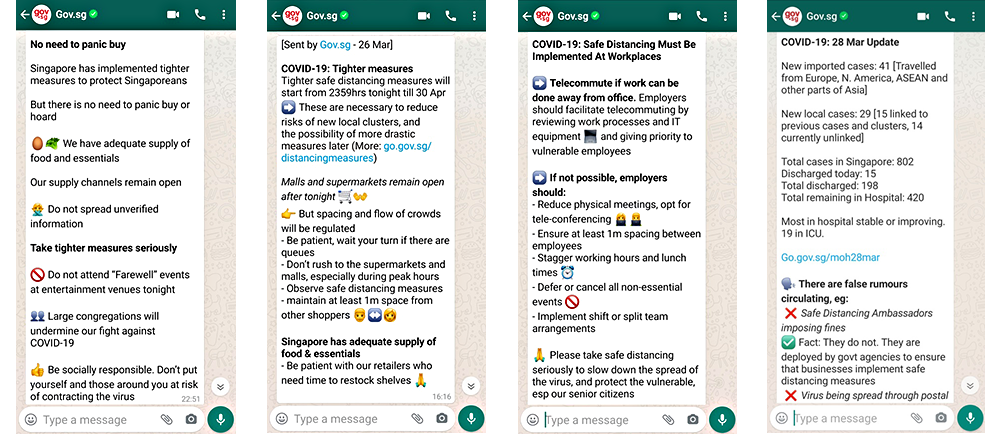 Le gouvernement de Singapour a lancé un canal Whatsapp dédié, ouvert à toute personne résidant à Singapour, afin d'assurer une transparence totale de l'information, d'inspirer confiance et d'informer tout le monde des nouvelles mesures qui seront mises en œuvre le plus rapidement possible. Jusqu'à présent, les informations partagées comprennent :