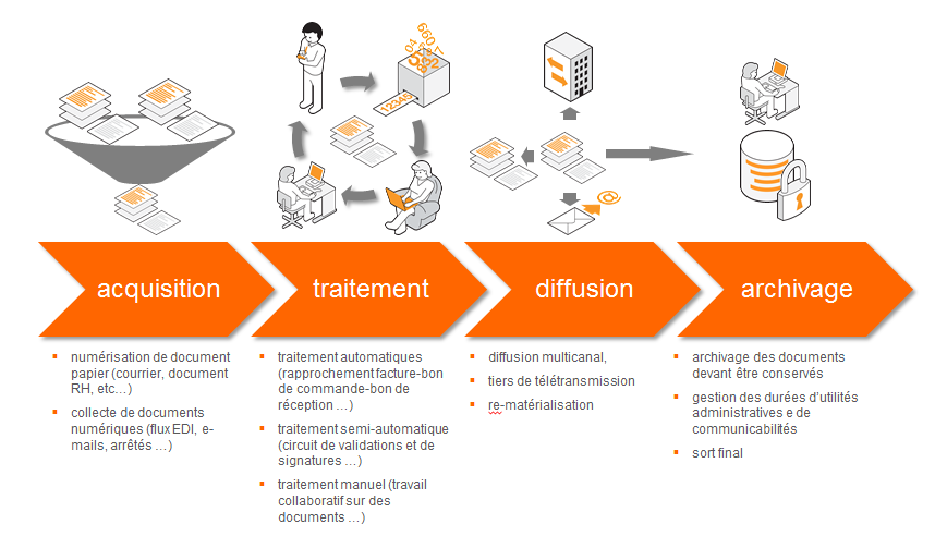 C’est l’objet premier des solutions de GED (Gestion Electronique de Documents) ou des ECM (Enterprise Content Management). La GED s’intéresse principalement aux documents de l’organisation, alors que l’ECM se concentre sur l’information en général et a donc un domaine beaucoup plus vaste que la GED.