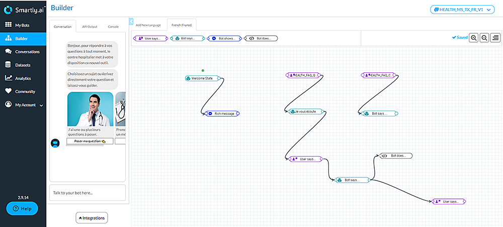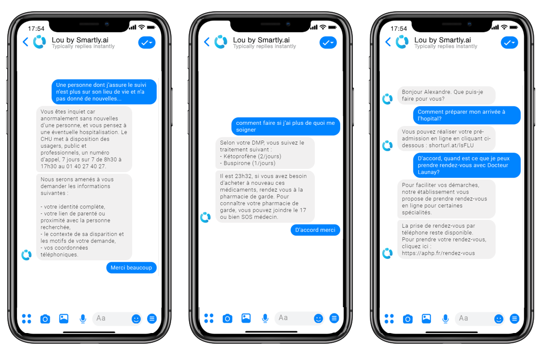 Smartly.ai est une entreprise spécialisée dans le traitement du langage naturel et le machine learning. Avec pour vision de rendre le monde plus conversationnel, c’est déjà plus de 50 chatbots et voicebots réalisés en 4 ans d’activité. Au fil des projets, nous avons conçu une méthodologie de conception et de développement adaptée aux besoins de nos clients. En janvier 2019, nous avons lancé avec succès le premier chatbot d’aide à la navigation sur le site internet du Centre Hospitalier Charles Perrens de Bordeaux. Notre objectif est simple : déployer des assistants virtuels afin de générer des gains de productivité pour l’établissement de santé et améliorer la qualité de la relation patient.
