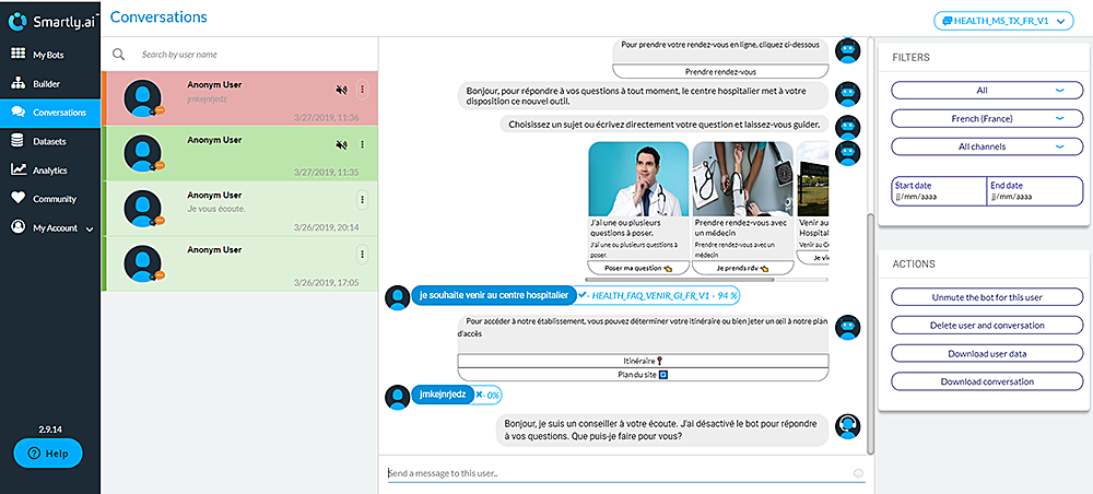 En janvier 2019, nous avons déployé avec succès le premier chatbot d’aide à la navigation sur le site internet du Centre Hospitalier Charles Perrens de Bordeaux. En 3 mois d’activité, plus de 21 000 usagers ont échangé avec le chatbot, et en moyenne 1000 demandes ont été reçues par jour. L’assistant virtuel rencontre un franc succès d’usage et démontre sa capacité à réduire les coûts de communication tout en augmentant la qualité de la relation patient.