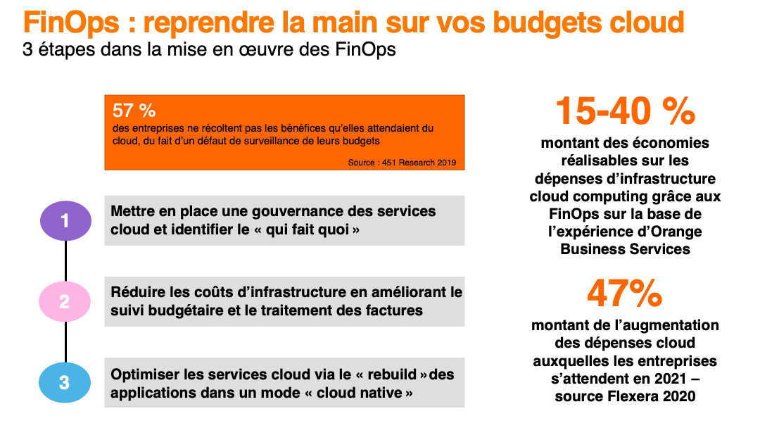C’est ici qu’intervient FinOps, expression raccourcie pour désigner la « gestion financière du cloud ». Il s'agit essentiellement d'un ensemble de pratiques visant à « rendre transparent, financièrement, le modèle de dépenses variable du cloud ». FinOps a pour objectif de piloter et d’optimiser la gestion du cloud, d’en réduire les coûts et d’accompagner la transformation des entreprises vers les applications « cloud native ».