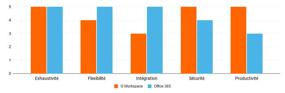 Pour révéler la vraie différence entre ces deux suites nous avons choisi de les analyser au regard de 5 critères : l’exhaustivité fonctionnelle, la flexibilité de l’offre, l'intégration dans le système d'information, la sécurité des données et la productivité des utilisateurs.