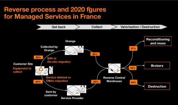 Dans les offres managées, Orange Business est propriétaire des équipements installés chez ses clients. Selon l’évènement sur la solution (upgrade, résiliation, SAV…), le matériel sera récupéré soit par le technicien d’intervention (environ 2/3 des retours) soit par un prestataire mandaté par Orange Business dans le cas des résiliations pour le tiers restant. Dans les 2 cas, le soin apporté au matériel sera un élément clé pour la suite du processus. Dans chacun des points de présence B2B d’Orange, les techniciens disposent de bacs spécifiques où ils peuvent y déposer les appareils. Ces bacs sont remontés vers l’entrepôt central basé en région lyonnaise. Pour les résiliations, Orange Business fournit hebdomadairement à son prestataire les coordonnées des clients à contacter en son nom ; une fois le matériel identifié, le prestataire adresse un bon prépayé au client pour qu’il puisse retourner le matériel qui sera aussi regroupé à l’entrepôt central B2B.