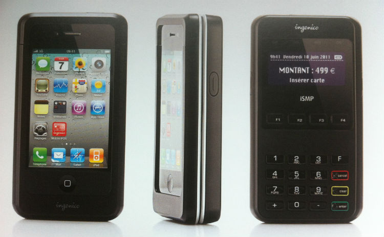 Intrigué je suis allé voir illico sur le stand des exposants Ingenico et Sedona en particulier : en fait, à peine plus grand qu'un téléphone portable (mais plus épais toutefois) le terminal se présente comme un outil à deux faces : d'un coté la facette "glamour" d'un iPhone ou IPod Touch pour l'approche et la séduction client, de l'autre un terminal de paiement plus traditionnel.