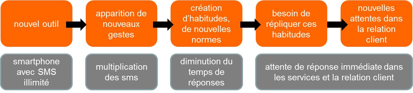 Ainsi, les nouveaux besoins chez les consommateurs en terme de relation client apparaissent par un processus très lent. On peut schématiser l’exemple du smartphone de cette façon :
