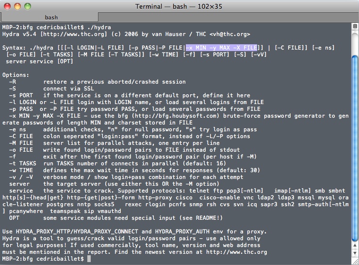 C’est donc avec une certaine satisfaction que j’ai découvert qu’un courageux avait modifié Hydra pour ajouter un module de génération de dictionnaire à la volée. Nouveau nom de baptême pour cette version modifiée : BFG, tout simplement pour Brute Force Generator.