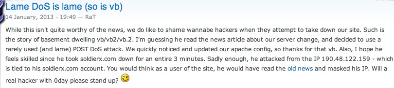 Le point intéressant ne se situe pas ici. Non content d’avoir bloqué cette attaque, l’équipe en charge du site a décidée de passer sur un mode plus offensif et de remonter la piste. Le résultat de ce travail a été la publication d’une news sur le site, avec notamment, l’adresse IP de notre « wannabe » hacker. De quoi s’inquiéter si l’on considère que les lecteurs fréquentant ce site peuvent avoir des idées dangereuses et les compétences associées.