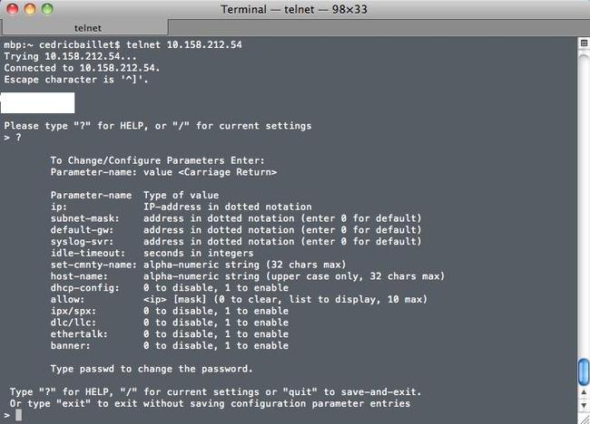 Il n’y a cependant que peu de paramètres accessibles, puisque l’on ne peut traiter que la configuration réseau. A part rendre l’imprimante inutilisable en changeant le paramétrage, il n’y a finalement que peu de chose possible sur ce service.