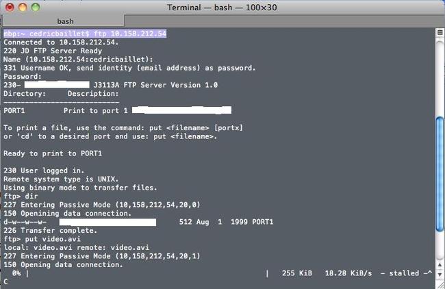 Mais que puis-je donc faire à partir de la ? Essayons de pousser un gros fichier vidéo par exemple. Il n’est pas exclu qu’une mauvais gestion de gros volumes puisse bloquer l’imprimante. Après tout, elle n’est pas faite pour traiter des fichiers de 800 Mo. Résultat ? Le lancement d’une impression à une ligne par page reprenant caractère après caractère l’encodage du film.