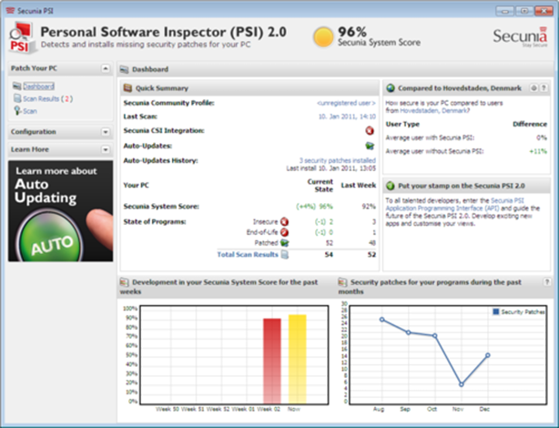 Dans la même philosophie que l'outil MBSA, la société Secunia propose quant à elle un outil plus complet dans la mesure où son périmètre d'inspection ne se restreint pas à l'écosystème de Microsoft. Pour information, le rapport 2010 de Sécunia indique que 50% des vulnérabilités des 2 dernières années ont été trouvées dans les produits de 14 éditeurs majeurs.