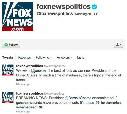 En effet, dès qu'un attaquant est en mesure de twitter sous le nom d'une société, les personnes qui suivent (les "'followers") prendront quasiment pour "argent comptant" les informations envoyées. En Juillet 2011, Fox News a annoncé la mort de Barack Obama