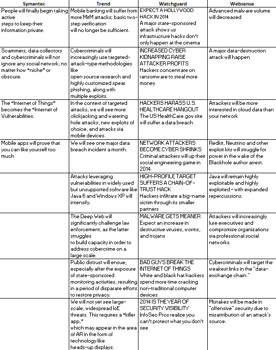 Ajoutons à ces grandes tendances des menaces plus anecdotiques à l’occasion de la coupe du monde de foot, contre les bitcoins ou plus locales comme celles contre le système de santé américain. 2014 devrait donc être, à en croire les éditeurs, une année riche en évènements de sécurité. Le tableau récapitulatif vous aidera à vous faire votre opinion.