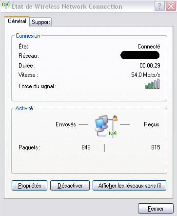 En principe, les pilotes de votre système d'exploitation sont livrés avec des outils permettant d'obtenir facilement la puissance de réception d'un signal Wifi. Sous Windows XP, le commun des mortels se contentera d'une jolie série de barres colorées :