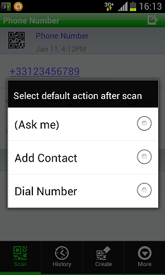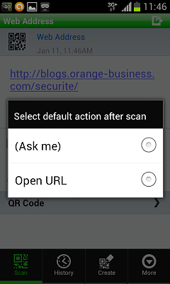 A titre d'exemple, la première fois que vous scannez un QR code sous QR Droïd, ce dernier vous propose de déterminer le parcours de validation par défaut pour ce type de code QR. Après avoir scanné un code QR renvoyant une URL, QR Droid vous proposera ceci :