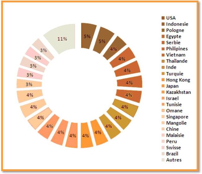 Ces statistiques mettent les États-Unis et l'Indonésie au sommet des pays générateurs du trafic DDoS. Ceci peut s'expliquer par le fait du nombre important d'ordinateurs aux États-Unis. Par contre pour le cas indonésien, cette étude révèle une absence des mesures de sécurité sur le segment réseau de ce pays et par conséquent l'identifie comme une cible privilégiée des pirates informatique pour déployer leurs réseaux Botnet.