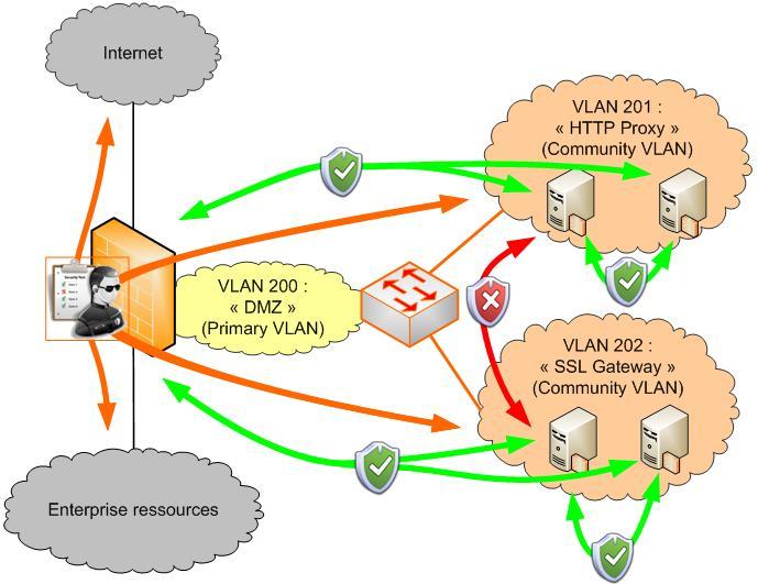 Pour cela, nous allons avoir pour l'exemple des serveurs Proxy et des Passerelles SSL dans des VLAN « Community » séparés, et nous allons retrouver notre Pare-Feu dans un VLAN « Primary ».