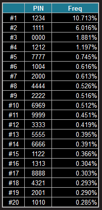 L'actualité récente nous a rappelé ô combien l'utilisation d'un code d'accès trop simple représentait un maillon faible pour tout système. Qu'en est-il lorsque le système vous propose de choisir parmi 4 chiffres entre 0 et 10 ? ... voici un billet "tendances des codes PIN automne-hiver 2012" !