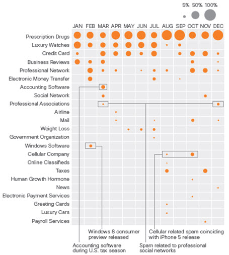 Le but du jeu pour les spammeurs est également de coller au mieux avec nos (supposées) préoccupations et profiter de tout ce qui pourrait permettre aux spams de se faufiler parmi les mails légitimes. Ils vont donc utiliser des mots clefs liés aux activités de saison : Noël, Thanksgiving ou le Black Friday (jour qui marque le début des achats de fin d’année) pour nous attirer comme le montre Symantec sur le mois de novembre 2012.