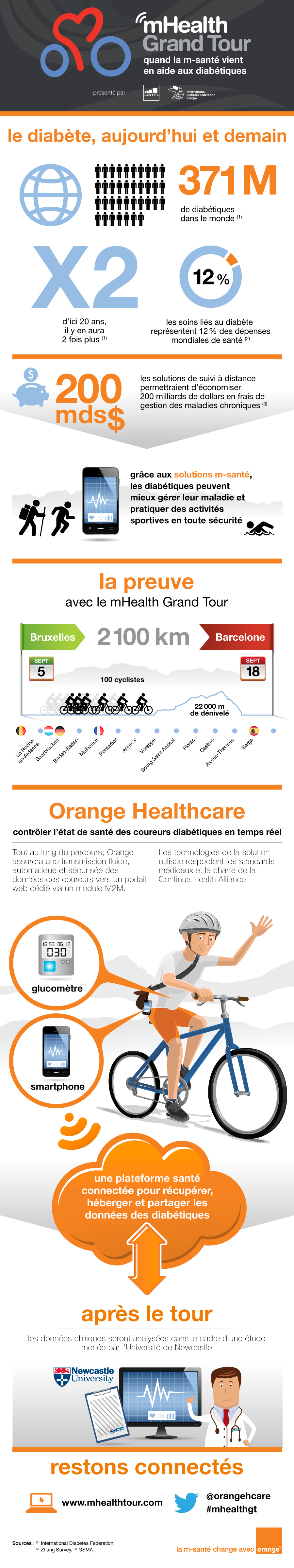 Le mHealth Grand Tour, c’est une formidable opportunité de faire connaître le diabète et les solutions innovantes pour gérer la maladie au quotidien. 100 coureurs vont rallier Bruxelles et Barcelone pour montrer comment les solutions de m-santé aident les patients dans la gestion au quotidien de leur maladie et peuvent contribuer à améliorer leur qualité de vie. Orange est partie prenante de cet évènement et fournira la solution technique pour permettre le suivi à distance des patients diabétiques tout au long du parcours, dans les 5 pays traversés.