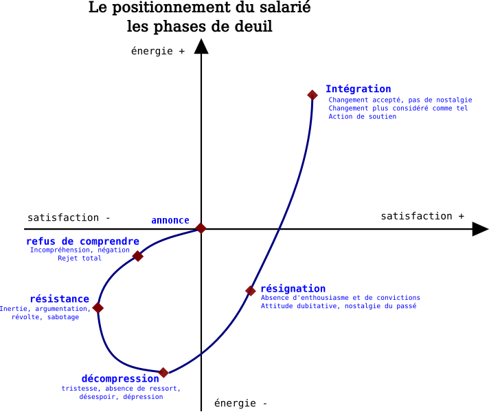 Le changement, c’est maintenant ! Mais petit bémol, les individus sont connus pour être résistants au changement. L’acceptation est souvent précédée de plusieurs phases comme la colère, le déni ou la tristesse La courbe du positionnement du salarié et des phases de deuil nous montre cette résistance au changement, en fonction de la satisfaction et de l’énergie :