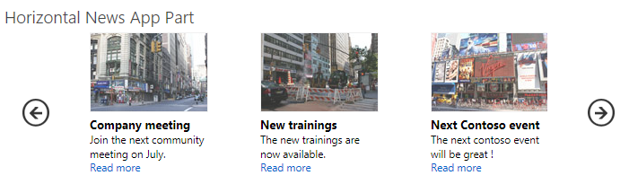 Cette application met à disposition 3 webparts très intéressantes pour afficher des actualités sur vos sites. Vous indiquez pour chaque actualité, une image, un titre, une description et un lien. Retrouvez ci-dessous les trois webparts disponibles dans le package :