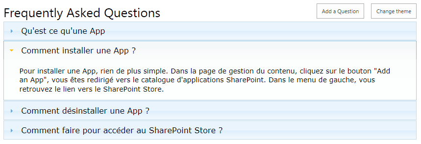 Cette app met à disposition un composant de type FAQ avec un affichage plus intuitif que ce que nous avons l’habitude d’avoir avec le forum de discussion natif de SharePoint. Le composant affiche les différentes questions, la réponse est disponible après le clic de l’utilisateur. Les données ne sont malheureusement pas stockées dans une liste SharePoint et donc pas exportables. Un autre regret, les données ne sont pas affichées dans une webpart, il est nécessaire de rentrer dans la liste pour en consulter les données.