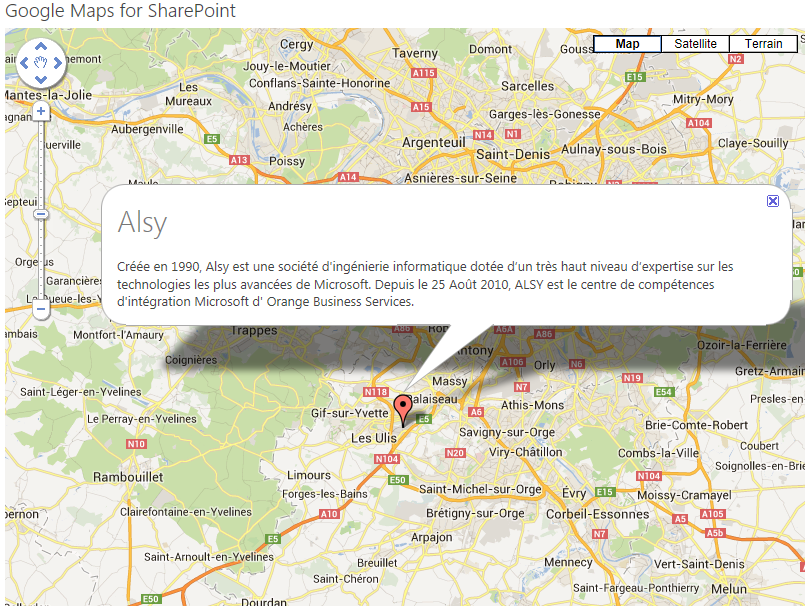 Cette App vous permet d’intégrer dans vos pages une webpart affichant les cartes Google Maps. Vous pouvez positionner un point dans la carte et lui ajouter une légende sous forme de bulle. Il est possible d’intégrer des balises HTML dans le contenu de la légende et vous choisissez le niveau de zoom.