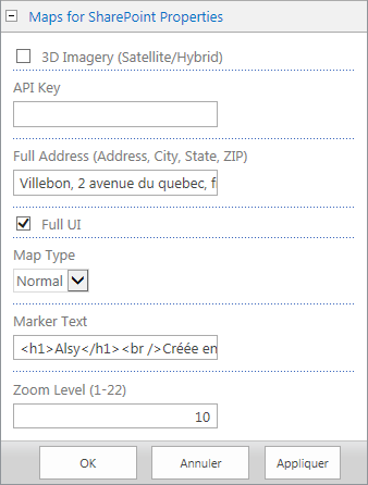 Aperçu de la webpart « Google Maps for SharePoint » et paramètres, cliquez pour élargir
