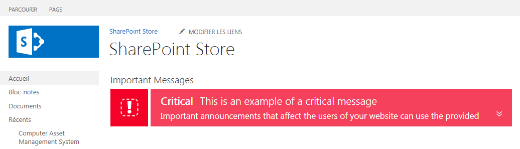 Cette webpart permet aux administrateurs de site de positionner sur leurs pages de façon très simple des messages d'alertes visuellement très clairs. La webpart affiche un aperçu du message d’alerte, l'utilisateur peut déplier la zone pour consulter le message complet.