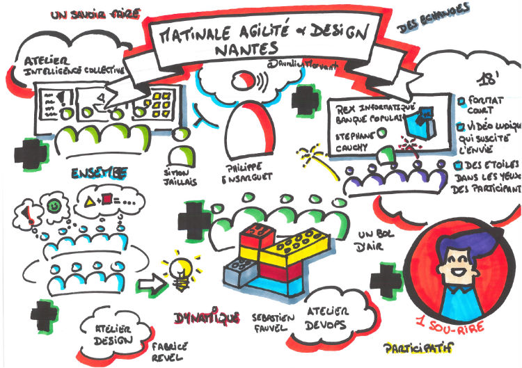 Le maitre mot de la matinée était « s’il vous plait, pas de projection PowerPoint », un mur, des supports papier, des feutres. Chaque personne venant à cette matinale a mis « les mains à la pâte » et s’est prise au jeu, en manipulant des Lego© pour illustrer les problématiques auxquelles répond l’approche Devops, pour créer une application iPhone ou enfin échanger autour de pratiques collaboratives.