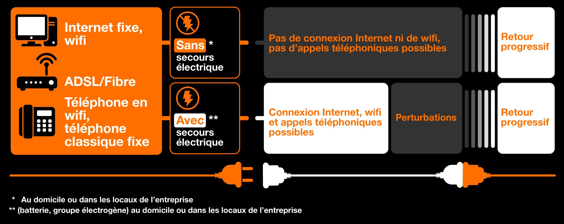 Votre box et routeur wifi doivent être branchés au courant électrique pour pouvoir diffuser la connexion au sein de vos locaux professionnels. En cas de coupure de courant dans votre entreprise et sans solution d’appoint (batterie, groupe électrogène), les connexions internet, wifi et les appels téléphoniques (VOIP) seront impossibles. De même, si vous utilisez des services de Téléassistance, télésurveillance, fax, Terminaux de Paiement Electronique (par carte bancaire) et terminaux à cartes (badgeuses, cartes SESAM-Vitale,…), ceux-ci seront également indisponibles.