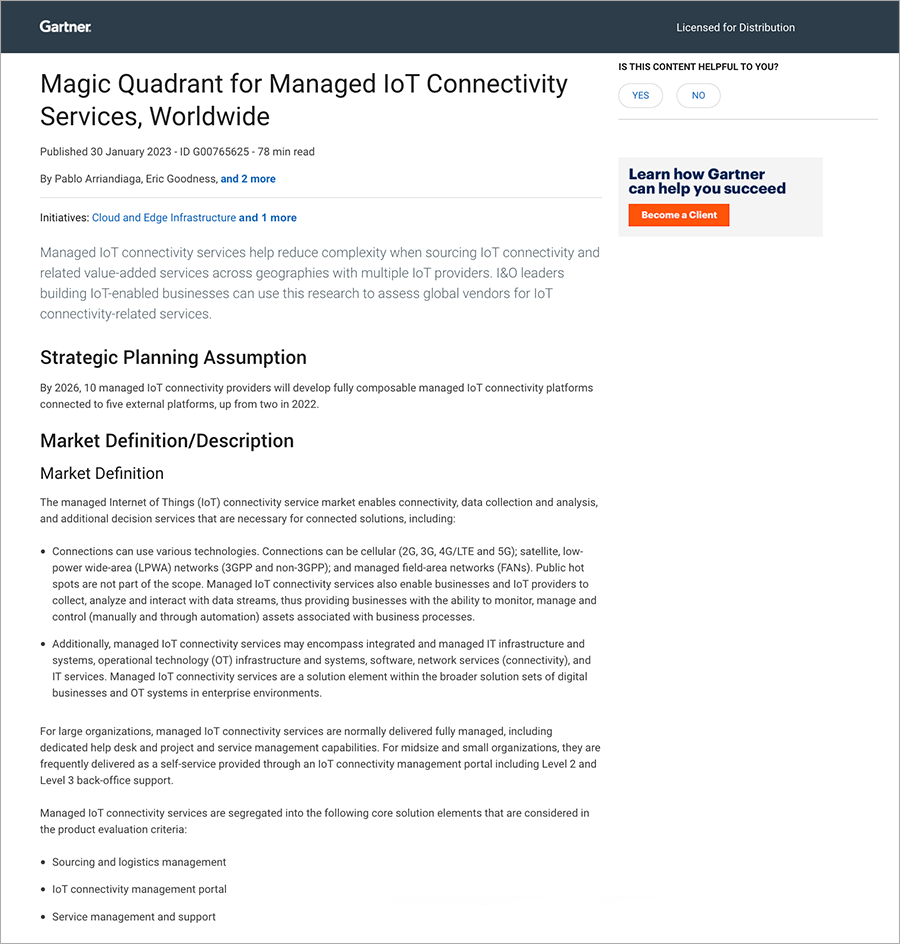 Source: Magic Quadrant for Managed IoT Connectivity Services, Worldwide Published 30 January 2023 - By Analyst(s): Pablo Arriandiaga, Eric Goodness, Kameron Chao, Jon Dressel