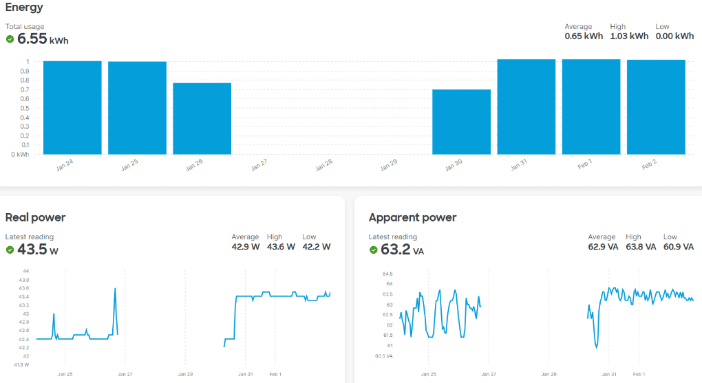 La consommation d'électricité a été mesurée sur une période de 4 jours à l'aide de capteurs MT40 Meraki "Smart Power Controller". Les capteurs ont été branchés entre l'alimentation électrique et la One Box d'une part, et la Dual Box d'autre part.