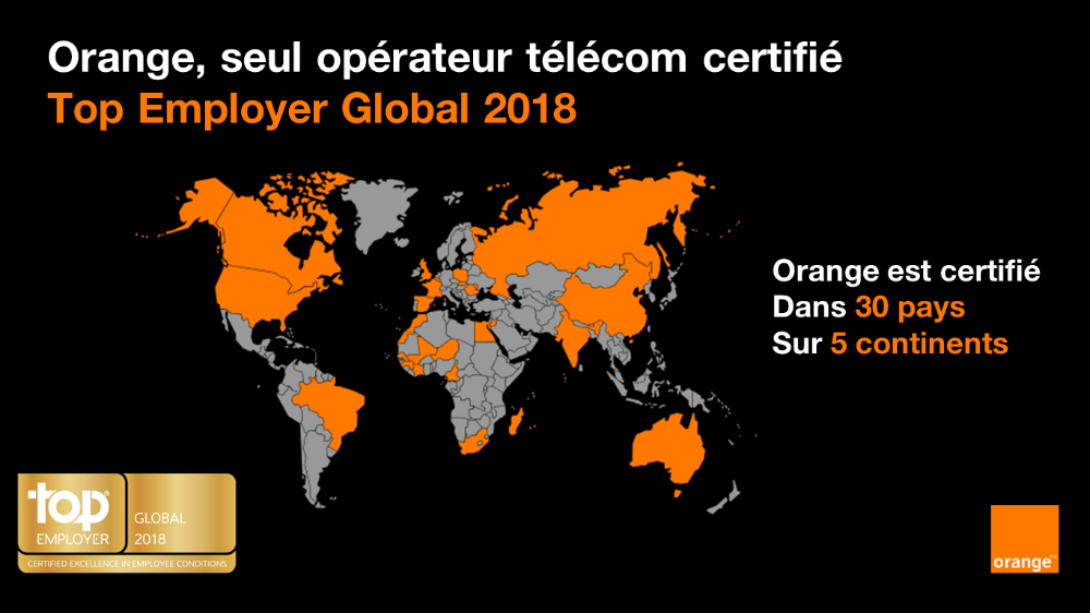 30 pays Orange sont certifiés Top Employers au sein des divisions OMEA (Cameroun, Côte d’Ivoire, Jordanie, Guinée-Conakry, Madagascar, Mali, Maroc, Niger, Sénégal et Egypte), Orange Business (Afrique du Sud, Australie, Brésil, Canada, Chine, Egypte, Etats-Unis, Île Maurice, Inde, Hong-Kong, Royaume-Uni, Russie et Singapour) et Europe (Belgique, Espagne, Luxembourg, Moldavie, Pologne, Roumanie, Slovaquie). La France est également Top Employer.